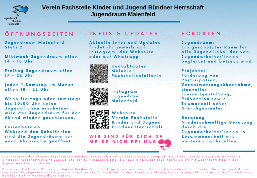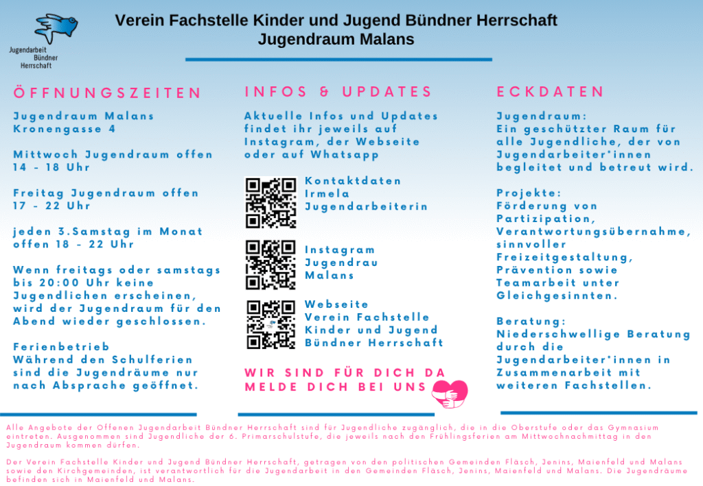 Die Jugendräume in Maienfeld und Malans stehen allen Jugendlichen aus den Gemeinden Fläsch, Jenins, Maienfeld und Malans offen. Natürlich dürfen auch Freund*innen oder Besuch aus anderen Gemeinden gelegentlich mitgebracht werden.