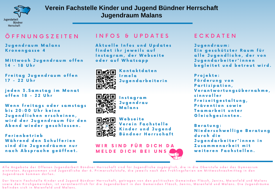 Die Jugendräume in Maienfeld und Malans stehen allen Jugendlichen aus den Gemeinden Fläsch, Jenins, Maienfeld und Malans offen. Natürlich dürfen auch Freund*innen oder Besuch aus anderen Gemeinden gelegentlich mitgebracht werden.